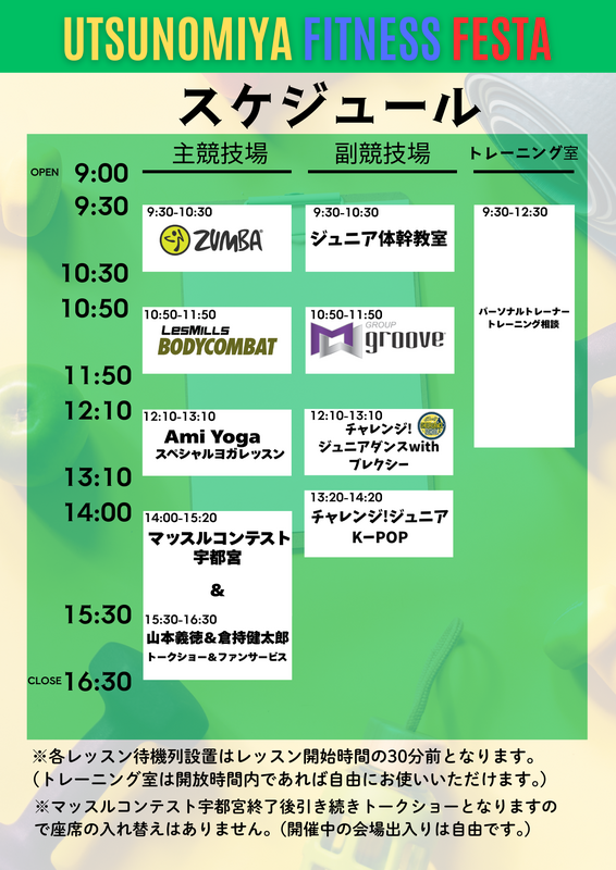 ・各レッスン入場待機列設置はレッスン開始時間の30分前となります。(10分前入場)。先着順定員になり次第締め切りといたします。(トレーニング室を除く)